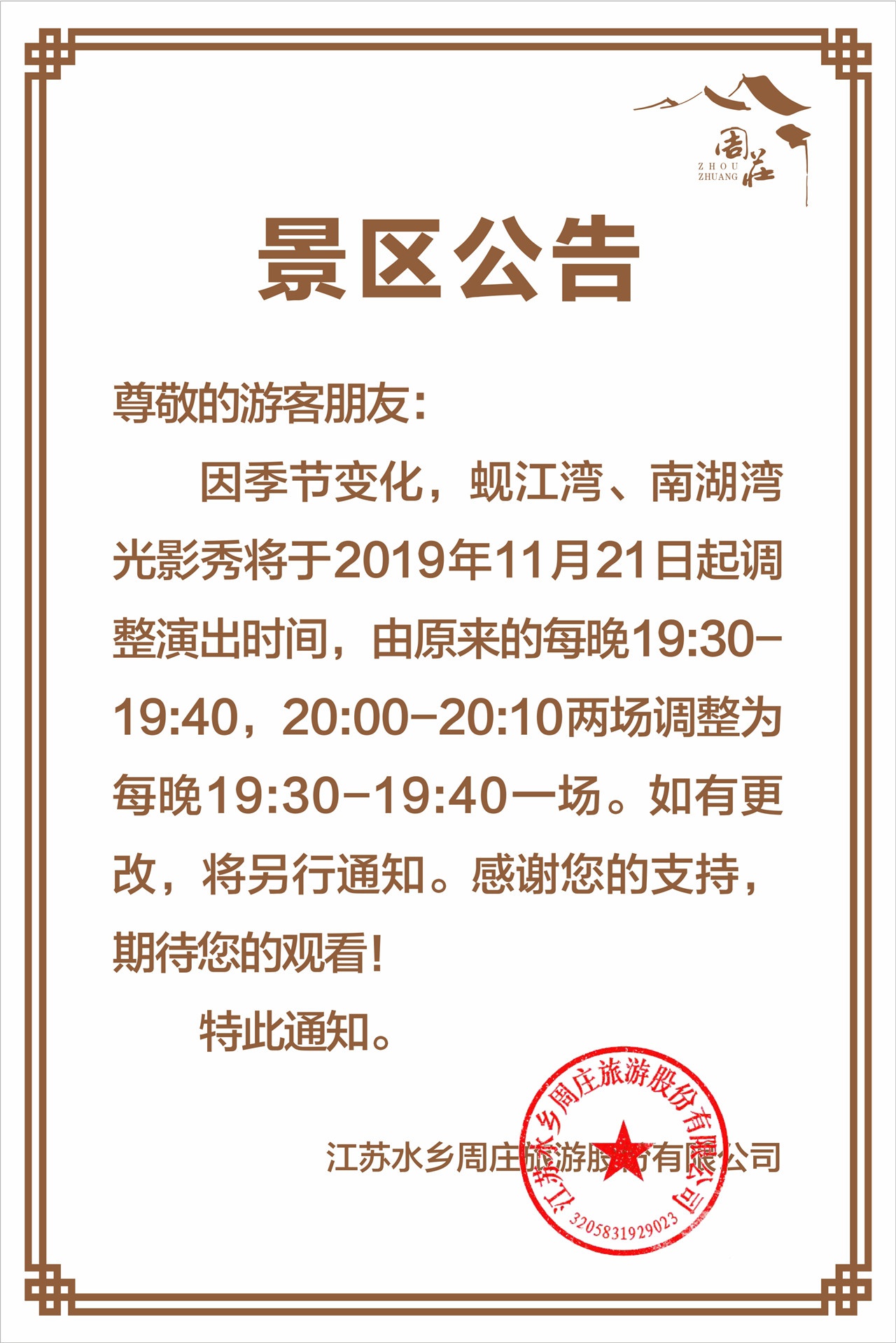 公告|《四季周莊》演出將于11月21日起停演