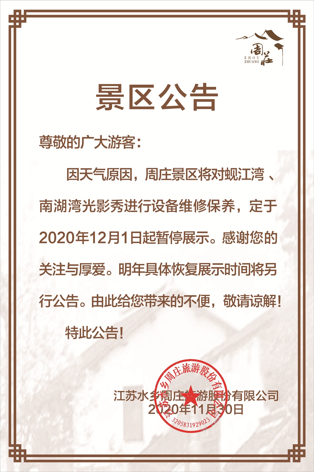 關(guān)于周莊景區(qū)光影秀演出時間調(diào)整的公告
