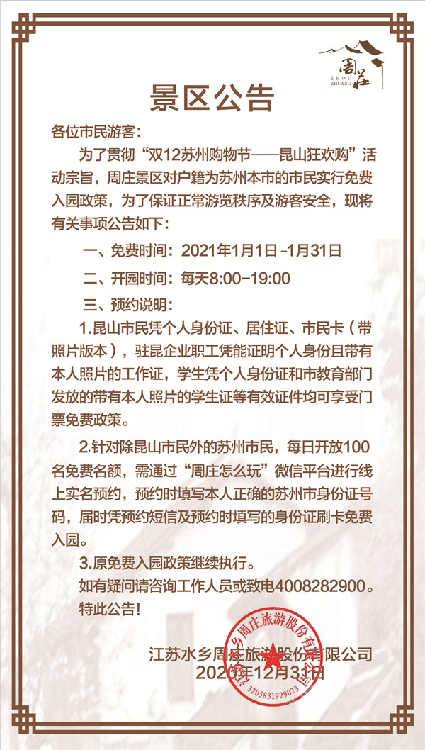 公告|周莊景區運營開放時間調整