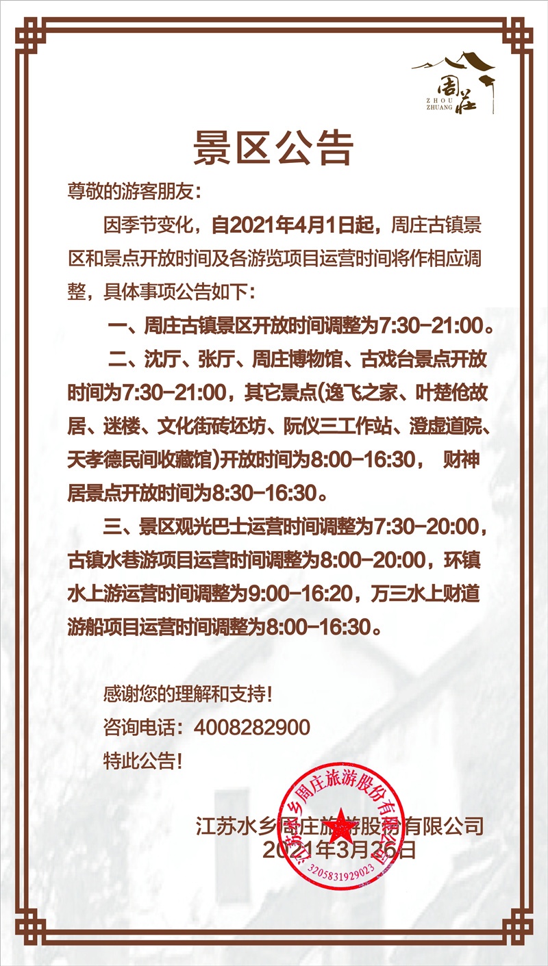 關(guān)于周莊古鎮(zhèn)景區(qū)開放時(shí)間調(diào)整的公告