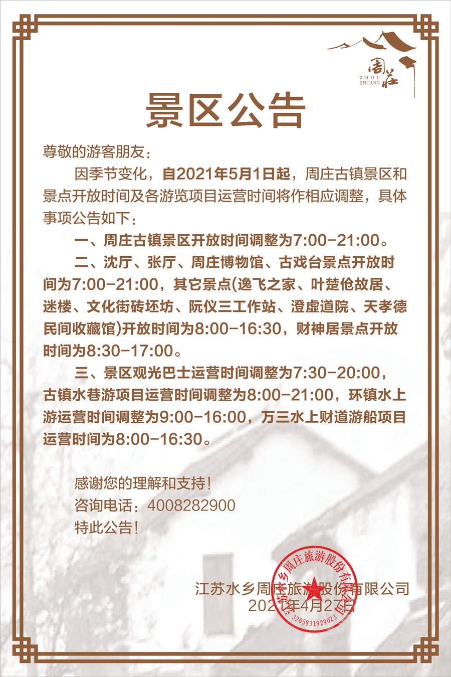 關(guān)于周莊景區(qū)開放時間調(diào)整的公告