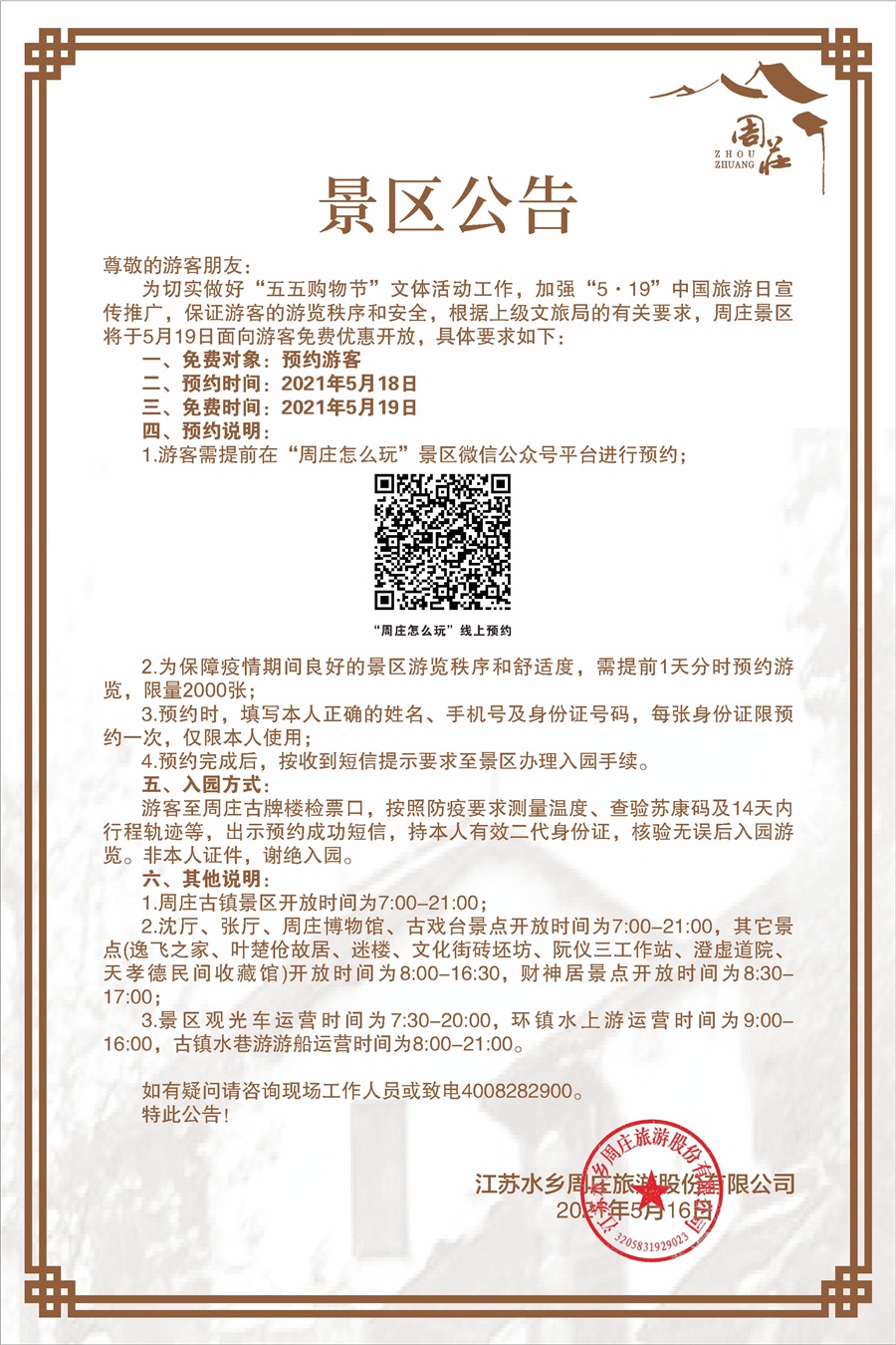 關于“5·19”中國旅游日周莊景區免費游的公告