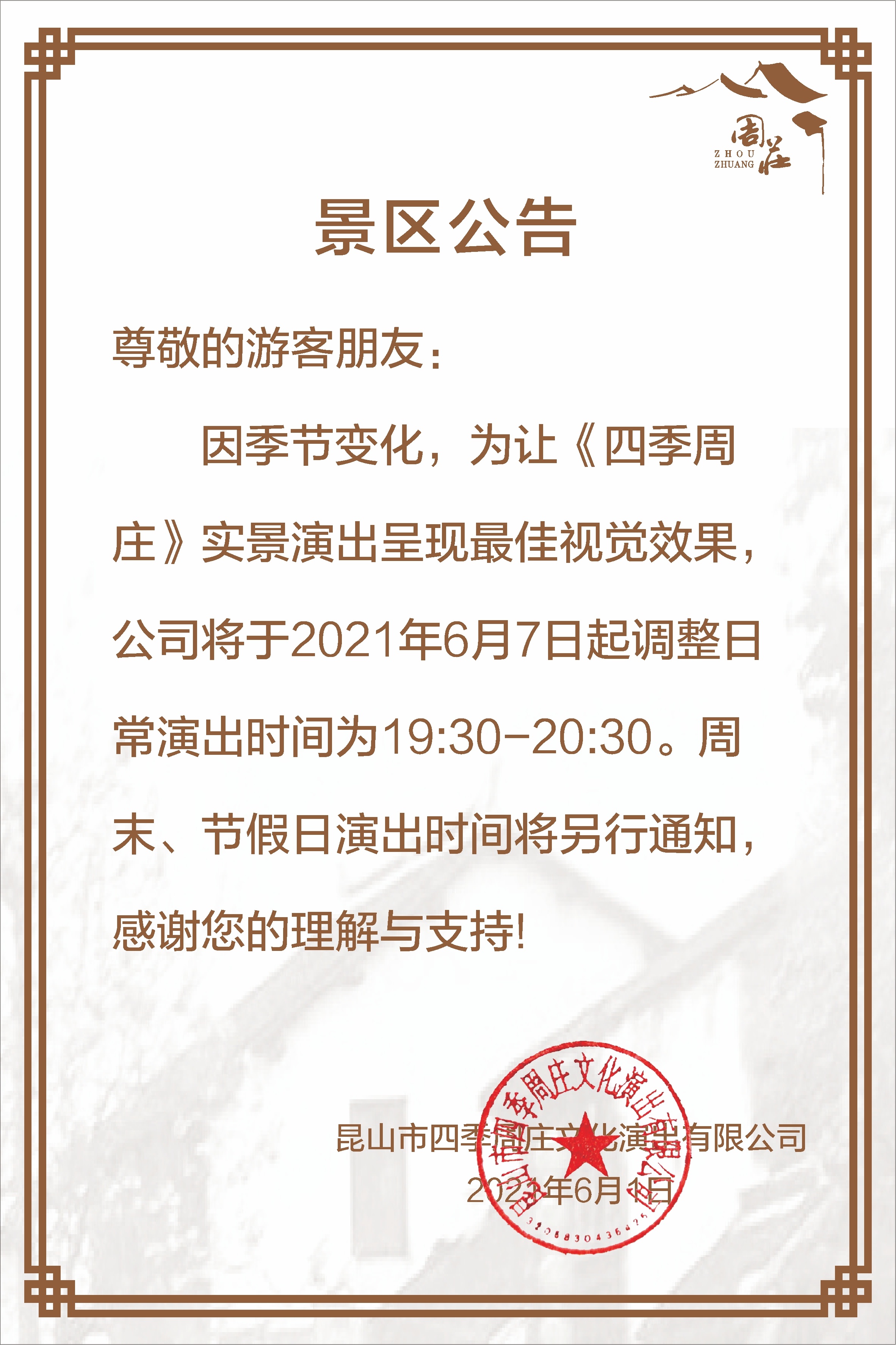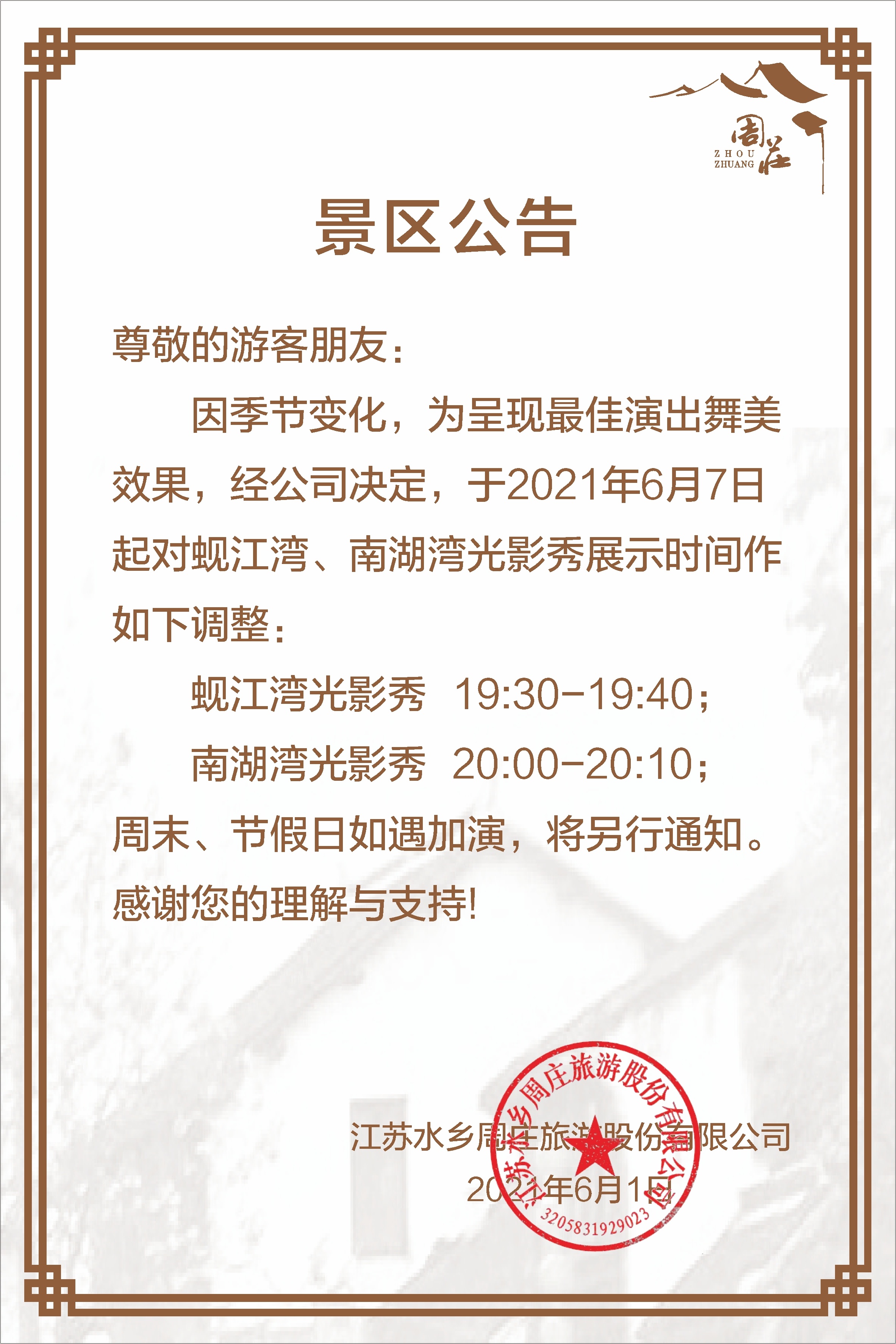 關于兩岸灣光影秀,《四季周莊》實景演出時間調整的公告