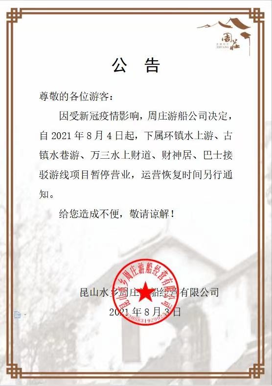 關于周莊景區游船、接駁等項目暫停運營的公告