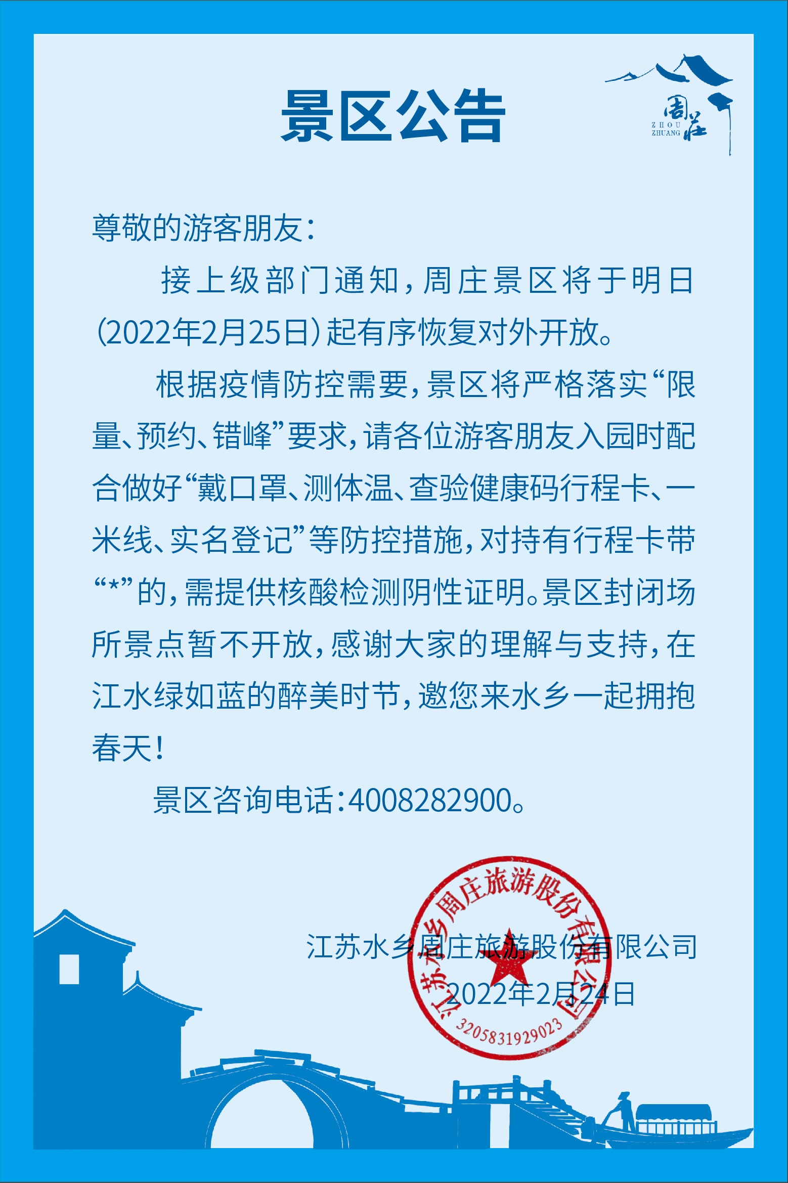 關(guān)于周莊景區(qū)有序恢復對外開放的公告