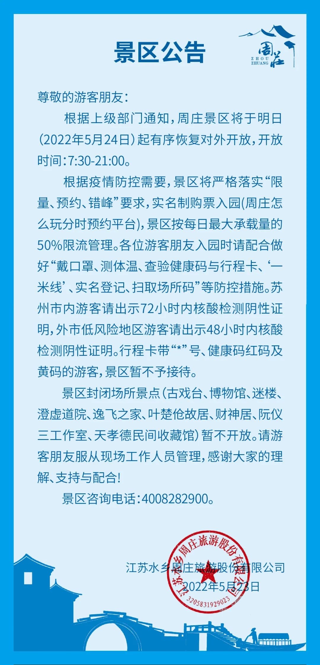公告 | 周莊景區5月24日起有序恢復對外開放