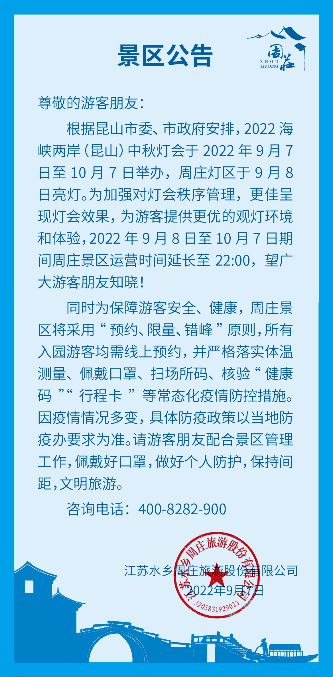 關于中秋燈會期間調整周莊景區運營時間的公告