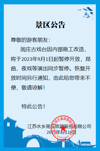 關(guān)于周莊古戲臺暫停開放的公告
