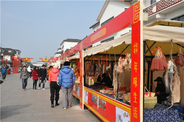 獨(dú)具水鄉(xiāng)風(fēng)味的年貨和特產(chǎn)被擺在了年貨區(qū)、美食區(qū),地道手工釀造的萬三黃酒是周莊對于游客最純樸且真摯的歡迎。制作精美的糖畫生肖、現(xiàn)場制作的海棠糕、蘿卜絲餅,在周莊年貨大街,吃的喝的玩的一應(yīng)俱全。