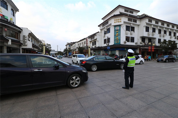 交警、旅游監(jiān)察隊(duì)員在外圍不斷指揮交通,確保游客順暢出行。