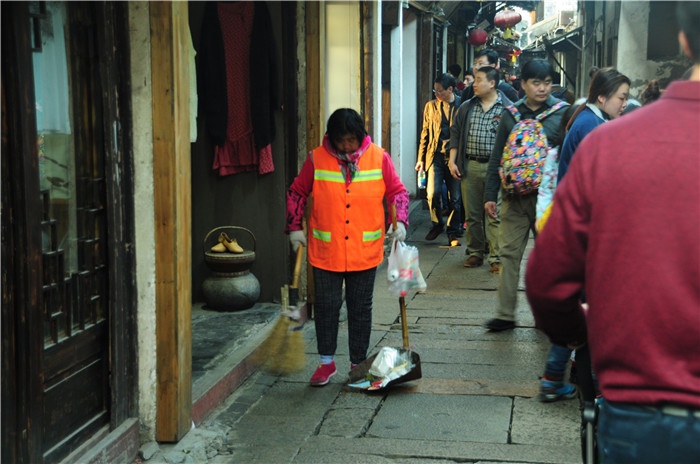 還有一群游走在古鎮(zhèn)各處默默無聞的環(huán)衛(wèi)工人,不辭辛勞,為游客呈現(xiàn)“中國第一水鄉(xiāng)”的整潔與美好。