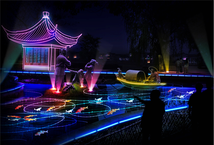 在南湖灣水面設置“月上南湖 情滿中華”大型燈組,南湖秋月園進行國風演藝。以互動燈組的形式展示中華傳統文化。制作中國地圖的大型燈面,游客可以關注微信后,為祖國加油祈福。