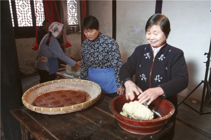 年二十八,周莊的阿公阿婆們,在臼子上揉和按比例調配過的粳米粉與糯米粉,加水,打出韌性,蒸熟。周莊的年糕出鍋了,比起蘇州其他地方的年糕來,這塊糕顯得面積更大、厚度更薄。他們在糕上鋪灑黃豆粉或干面粉,使糕不粘手,味更香,切成一個個小方塊,裝入油紙中,這是周莊的老年俗——“廿八裝糕”。