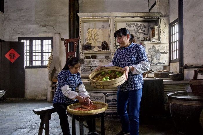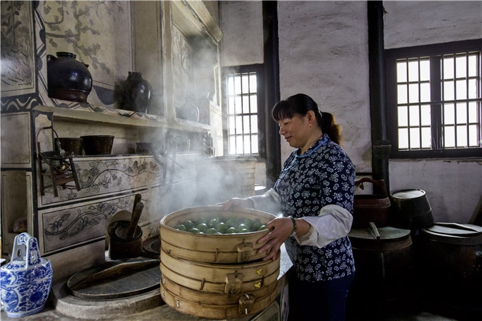 穿過(guò)幽深的沈廳長(zhǎng)廊,清香撲鼻而來(lái),帶著藍(lán)色印花布的廚娘,正在嫻熟而優(yōu)雅的制作著地地道道的周莊青團(tuán)。把剛剛摘下來(lái)的新鮮艾草洗干凈后打成汁,加入石灰粉一起煮,煮熟后漂去苦澀的味道,搗爛后配上糯米粉拌勻,反復(fù)揉搓,可以開(kāi)始制作團(tuán)子了。周莊青團(tuán)的餡是用細(xì)膩的赤豆與白砂糖制成的,現(xiàn)在也有用棗泥、玫瑰等其他餡料。