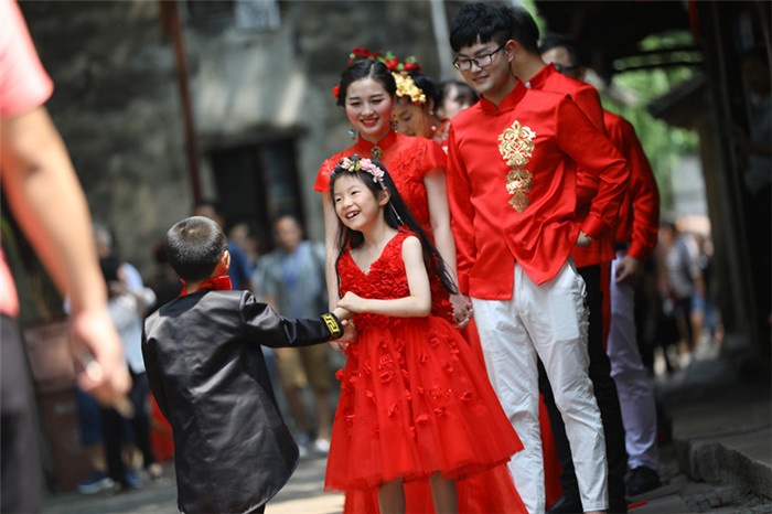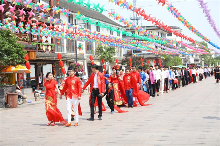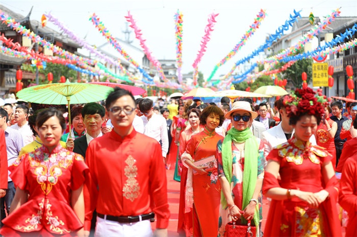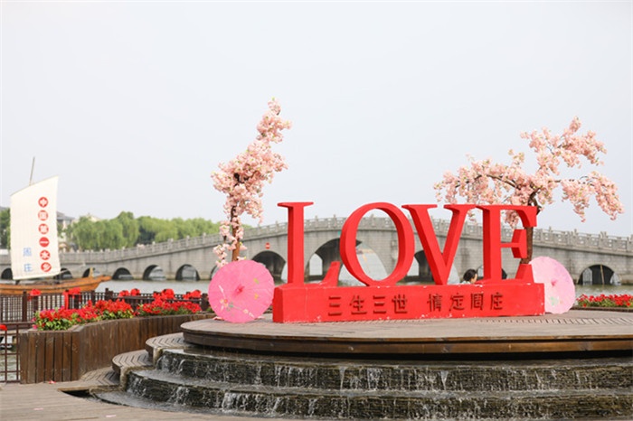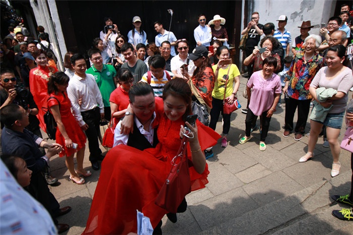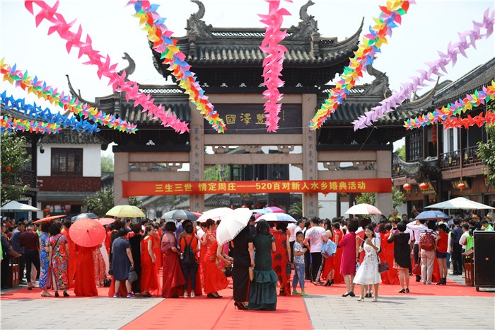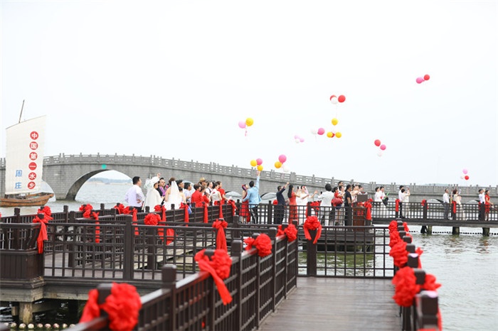 周莊古牌樓前,抵達現場的鎮民、網絡直播的觀眾都為遠道而來的愛侶們送上最誠摯的祝福。在全民見證下,新人們交換信物,共同許下愛的誓言,從此兩人感情天長地久、矢志不渝。