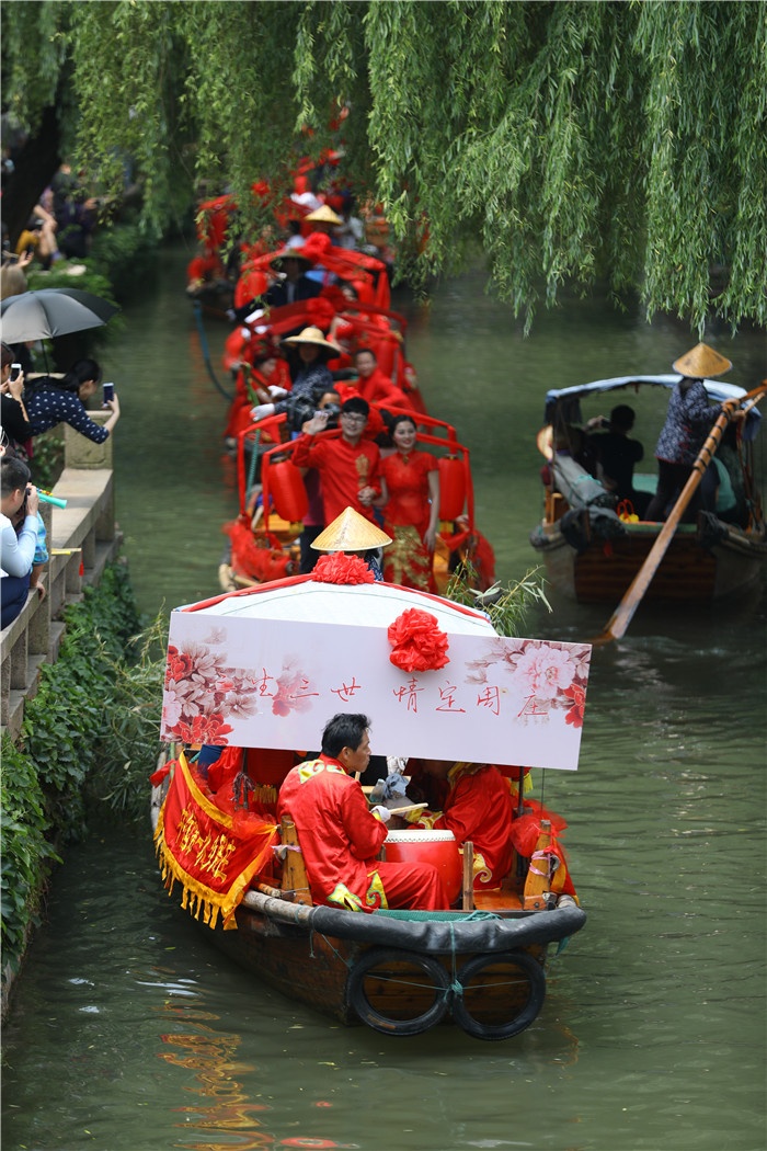不同于城市里如出一轍的豪車婚禮,在水網密布、街巷縱橫的周莊,新郎新娘乘坐裝飾一新的婚船,在兩岸街道居民游客的見證下,留下真愛的一吻。江南之地獨特的水域分割,造就了當地不同于陸路地區的婚禮文化。至今為止,水鄉婚禮傳統仍在周莊完好地保留著。婚船迎親是周莊水鄉婚禮習俗之一,也是江南水鄉人民寶貴的文化遺產。