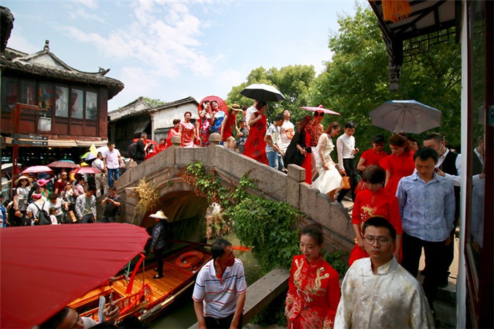 走三橋”是周莊水鄉婚禮的一道重要儀式。走過成雙成對、白頭偕老的雙橋,太平吉祥、萬事如意的太平橋和富貴平安、事業有成的富安橋,寓意著新人們的婚姻將會一路美滿。