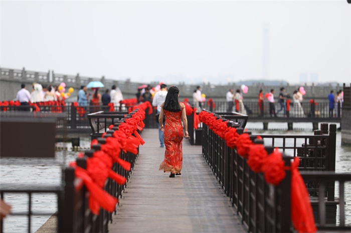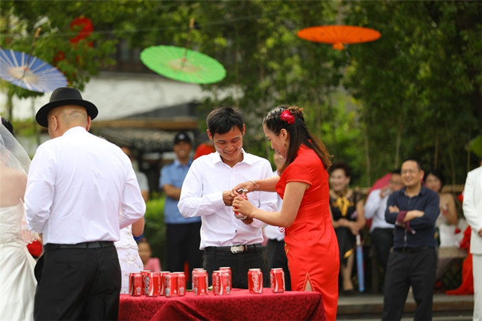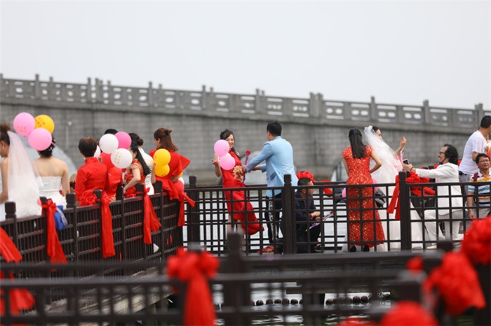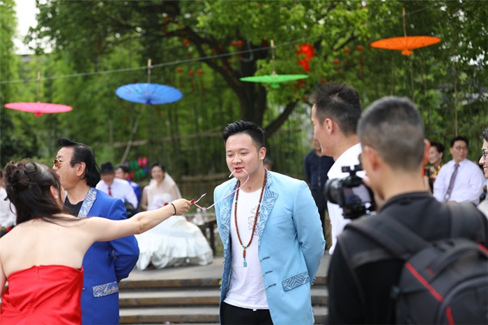 翠竹掩映的南湖秋月園里,“眉目傳情”、“說我愛你”、“伯虎點香”、“愿者上鉤”等一系列有趣的情侶活動,徹底將水鄉婚典推上高潮。