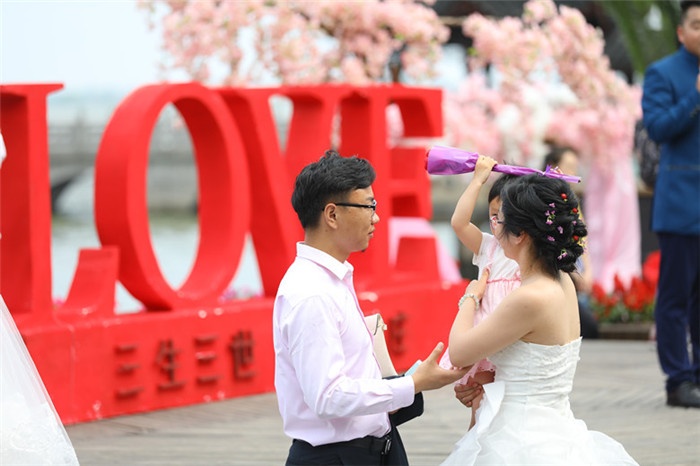 碧波無垠的南湖上,新人們在棧橋上定情,放飛的氣球在湛藍的天空上畫出一道唯美的弧線,扣上的同心鎖象征著新人們永不分離的誓言。