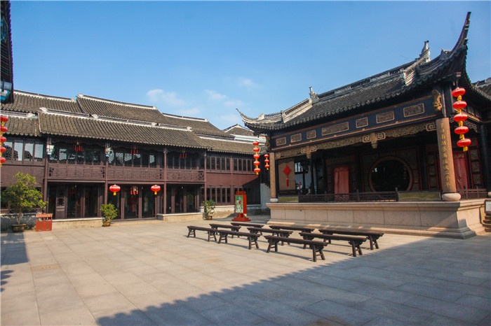 周莊古戲臺占地七畝,將典型的江南“走馬樓”式民居與戲臺相結(jié)合。正對戲臺的二樓以湯顯祖“玉茗堂”命名,在此俯瞰戲臺,品上一碗雨水燉煮的阿婆茶,就著毛豆子、腌菜莧、萬三糕,與本地老人邊聽邊聊,乃是最正宗的周莊生活況味。