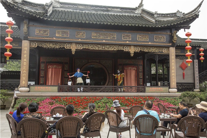 周莊古戲臺位于全功橋北市街上,坐南朝北。歇山式大屋面,兩瓦條滾筒,鰲魚正脊。檐下戲文花雕,荷花雕板掛落。臺中心屋頂是由420只木雕鳳凰盤旋而成的覆盆狀藻井,稱為“鳳凰藻井”。古戲臺常年演出昆曲,昆曲和古鎮(zhèn)兩個文化瑰寶競相輝映。帷幕掀起的時候,人生的愛恨情仇,悲歡聚散都在古戲臺上一幕幕鋪展。