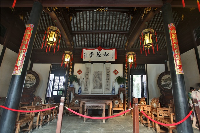 沈廳位于周莊富安橋東堍南側的南市街上,坐東朝西,七進五門樓,大小房屋共有一百多間,分布在一百米長的中軸線兩旁,占地兩千多平方米,為國家級重點文物保護單位。沈廳原名敬業(yè)堂,清末改為松茂堂,由沈萬三后裔沈本仁于清乾隆七年(公元1742年)建成。