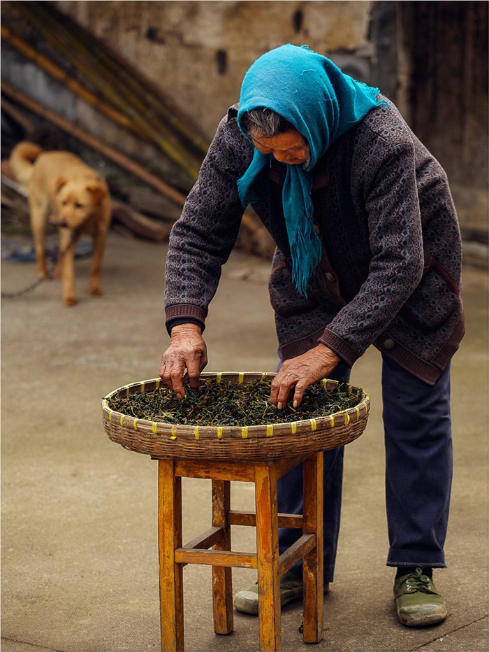 一位老阿婆蹲在門口擇菜,沒有誰來打擾她,她頭上那塊方頭巾,是這一帶婦女永久的飾物。
