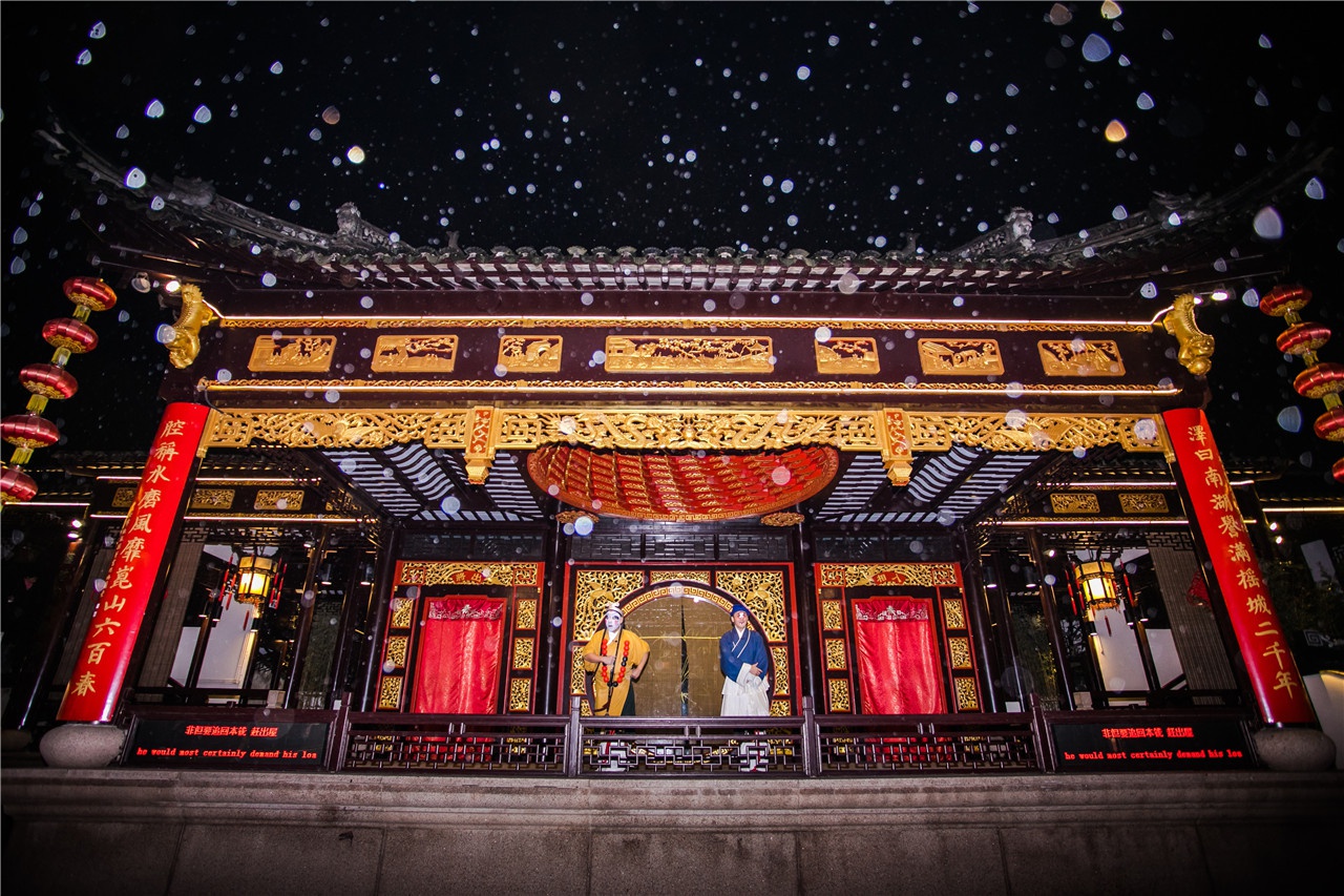 春節(jié)期間,古戲臺、聚賓樓、吃講茶等處,有地道的昆曲,評彈、越劇等地方戲劇表演。聽古戲臺昆曲的曲聲婉轉(zhuǎn),在周莊吃講茶內(nèi)和原住民們一起看年戲,是打開周莊年味的另一種方式。