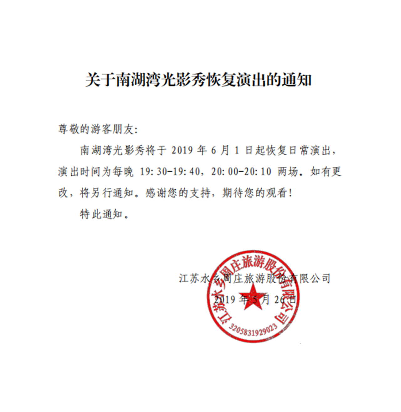 關于南湖灣光影秀恢復演出的通知