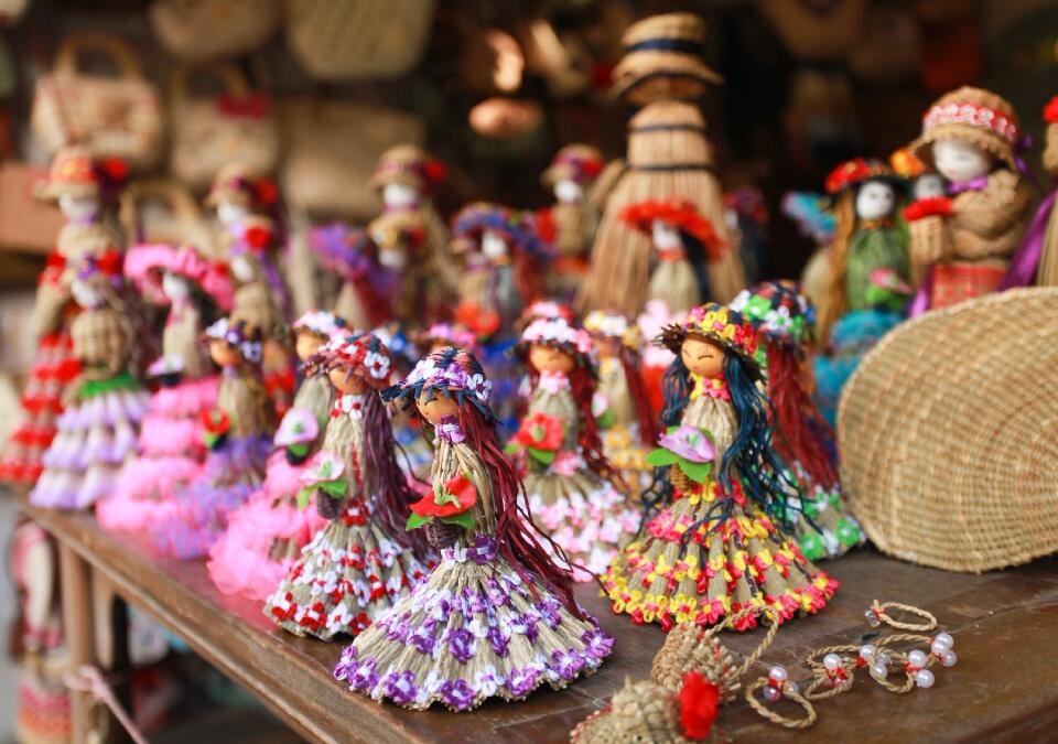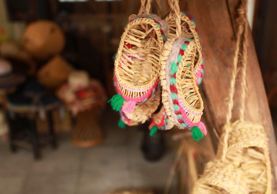 柔韌的草,在經過巧手的魔法,變成了具有藝術味道的手工制品,也許比巴黎流行的時尚還要具有藝術的味道。心靈手巧的匠工以編草席為主,店里有很多手工編制的包包、草席、鞋子、稻草人等。