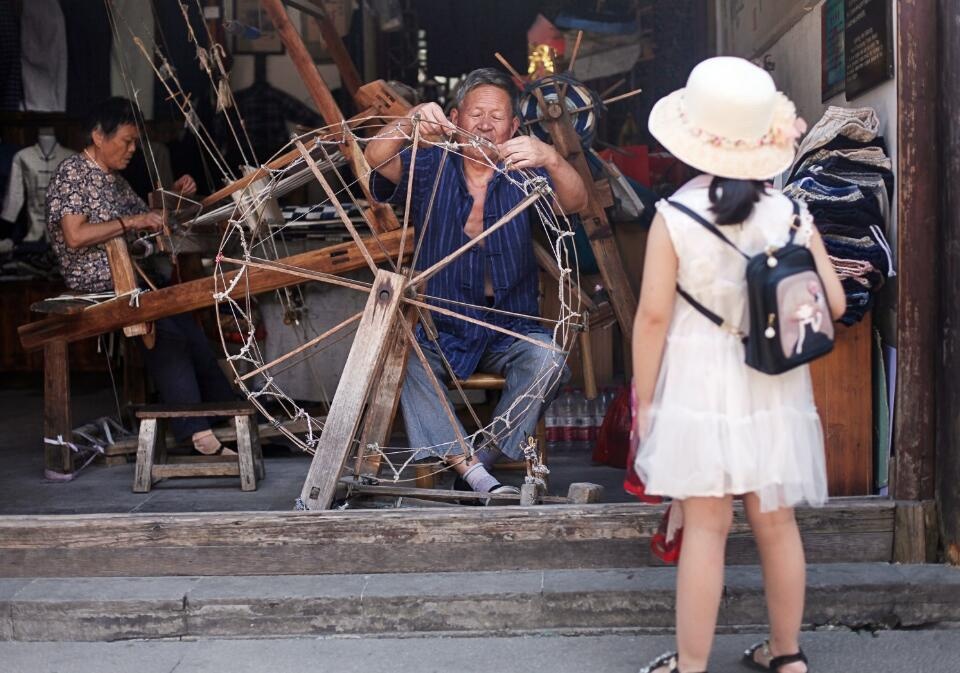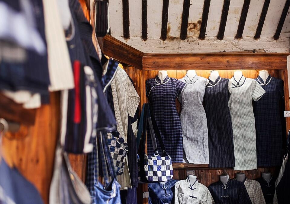 現場有紡線織布的工藝展示,原汁原味的傳統手工藝再現,紡車織機、阿婆靈動雙手和富有節奏的織聲,構成了極具江南韻味的土布織造圖。“周莊布”早已聞名于各地,可以購買到各色成品布及土布做成各類衣物。